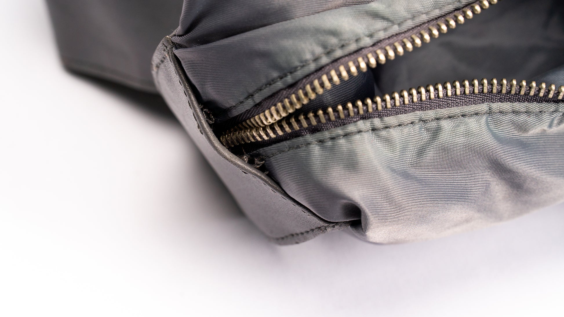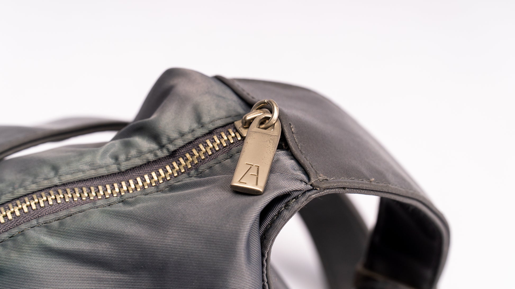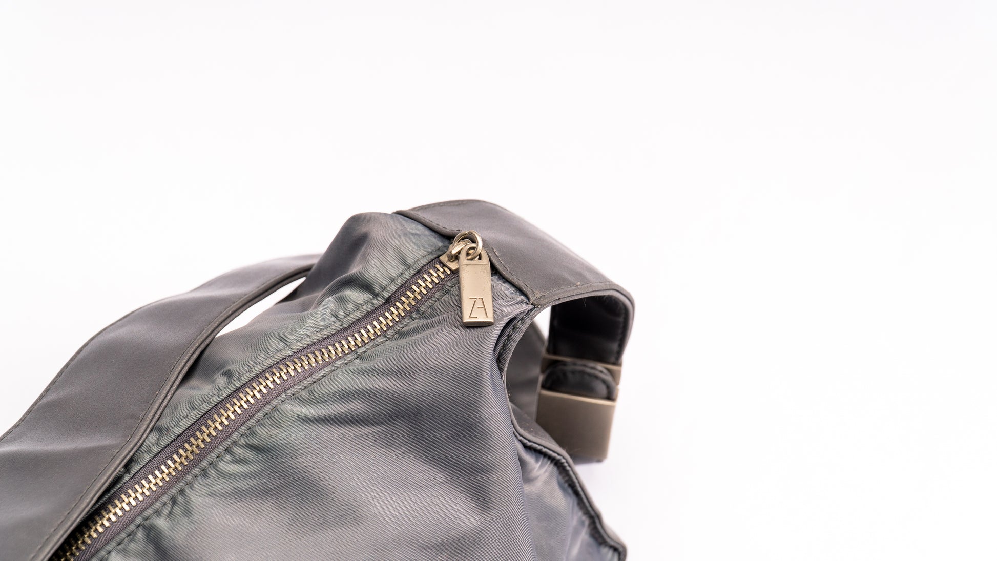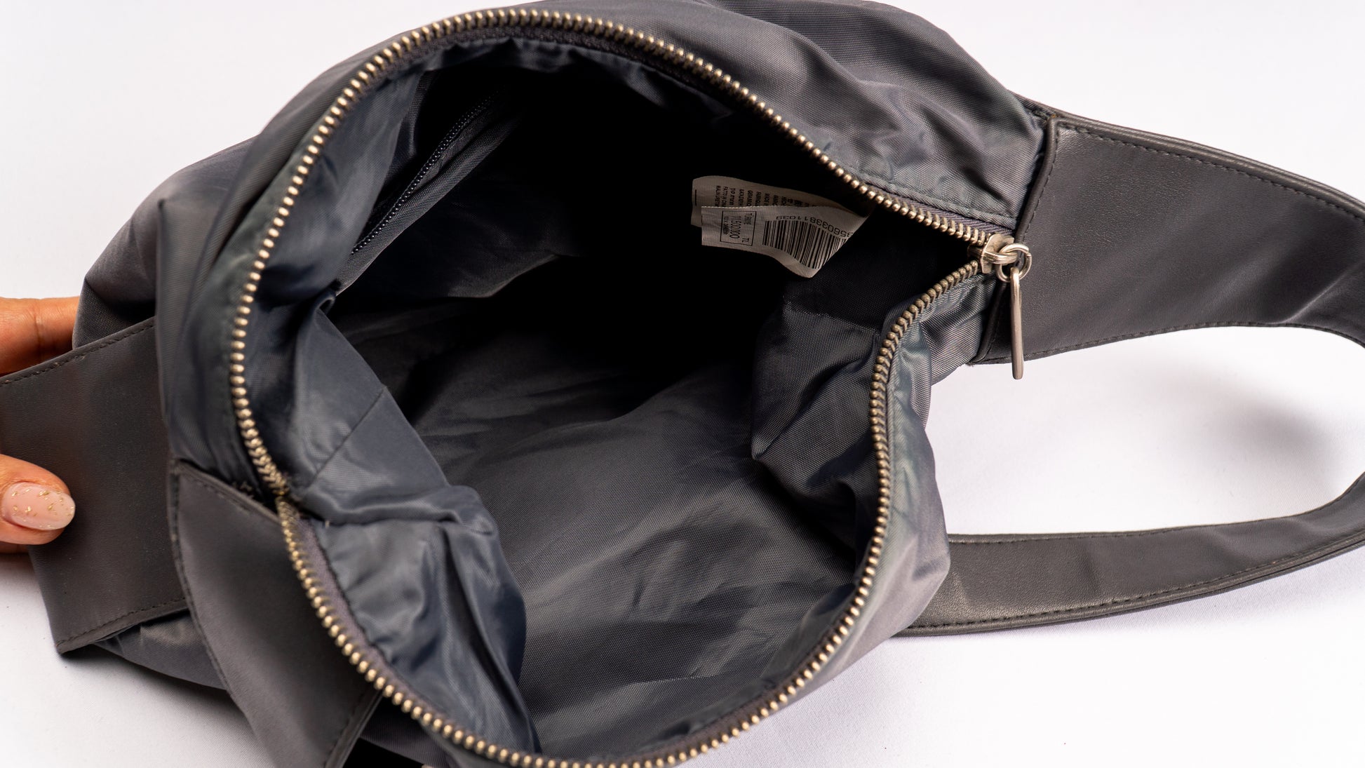Mala de ombro, em cor preta, com algumas marcas de uso.
