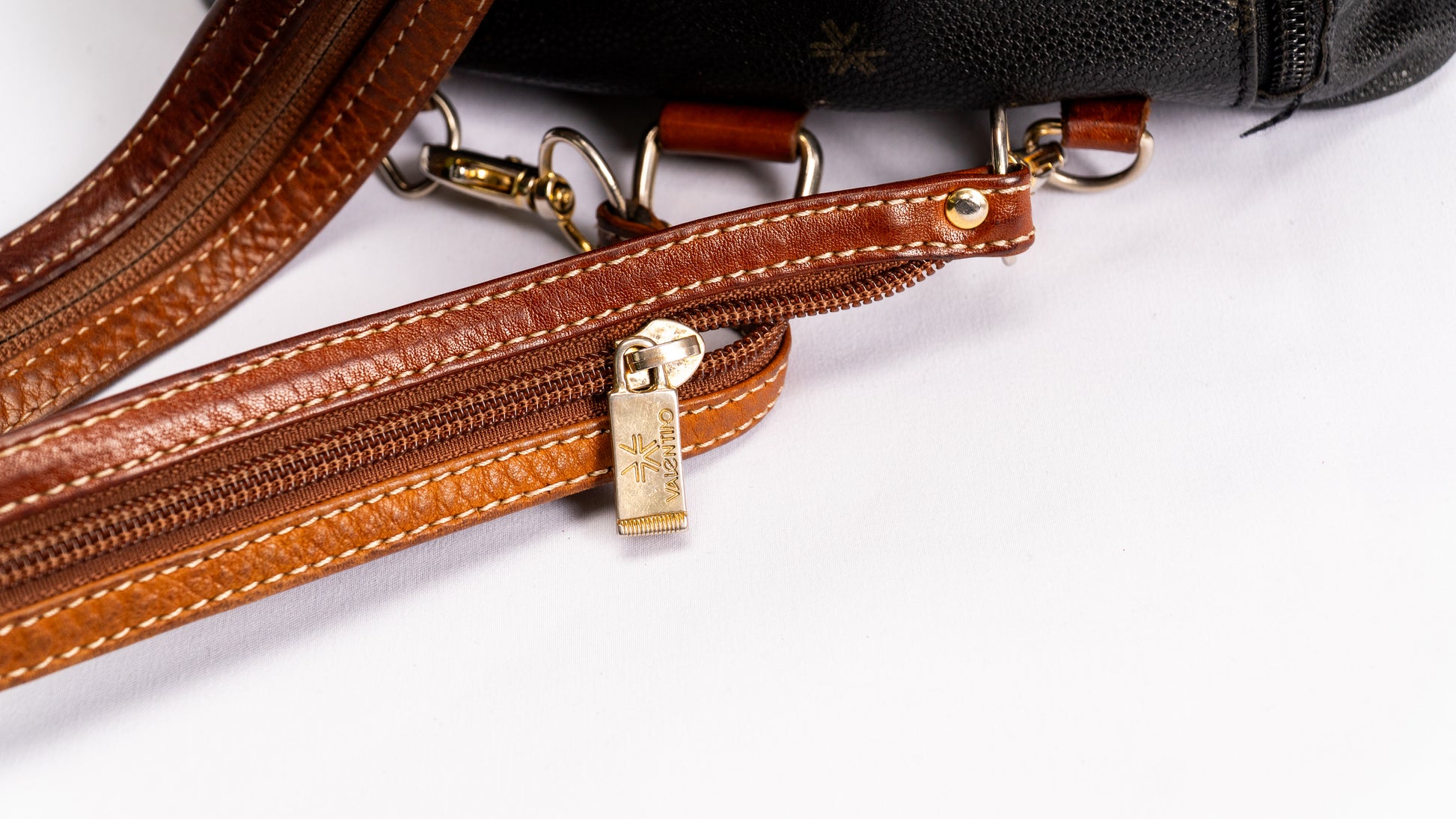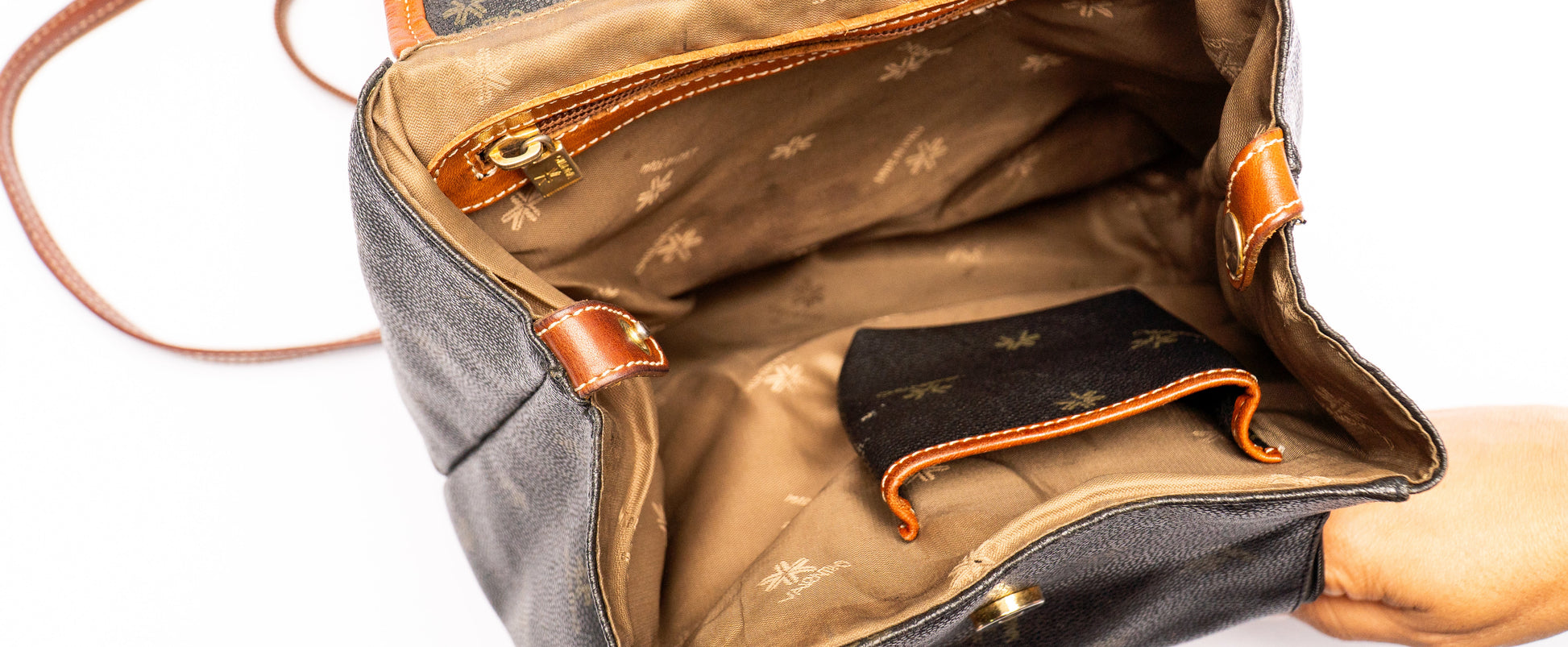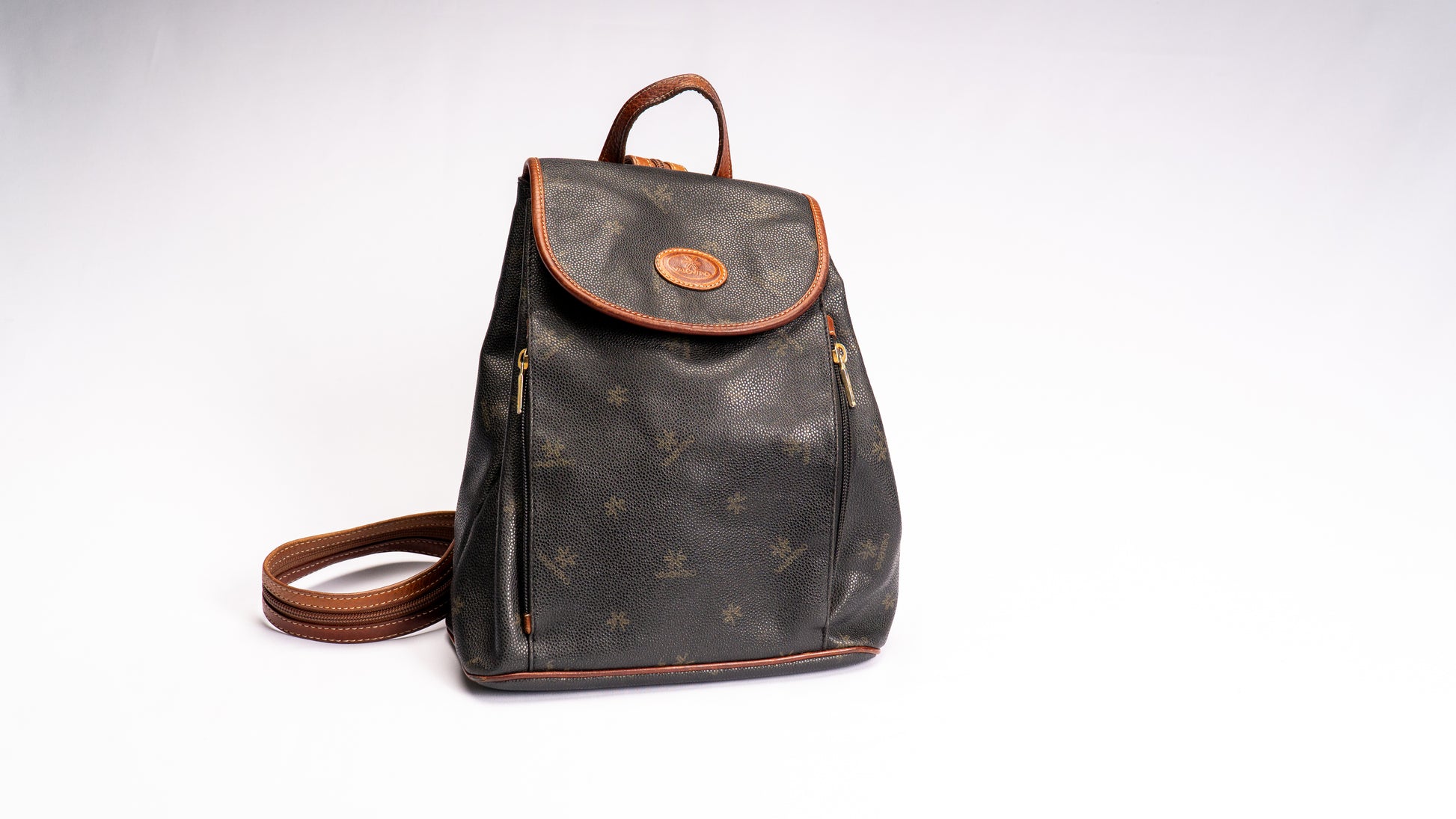 Mochila vintage em tons de castanho, com padrão. Vários bolsos exteriores com fecho éclair metálico, bolso interior e alsas removiveis.