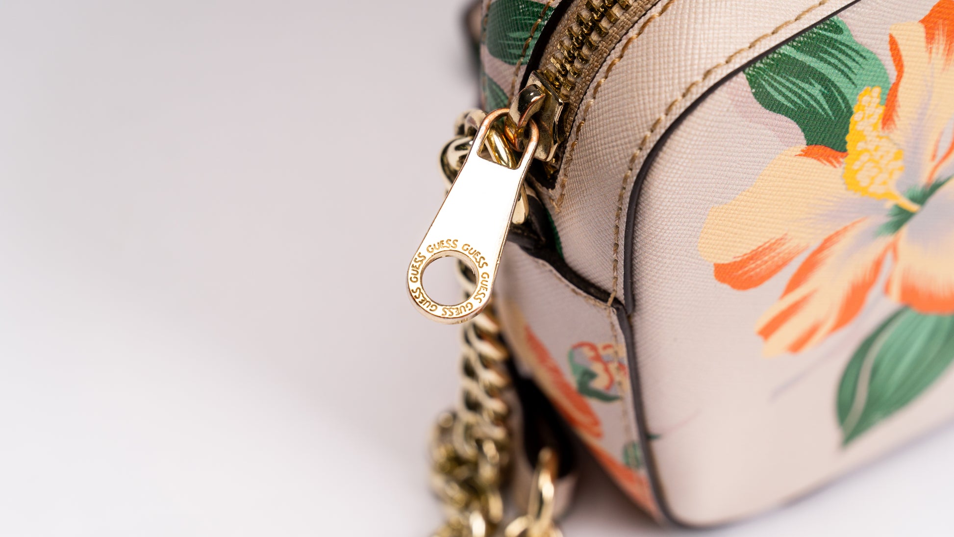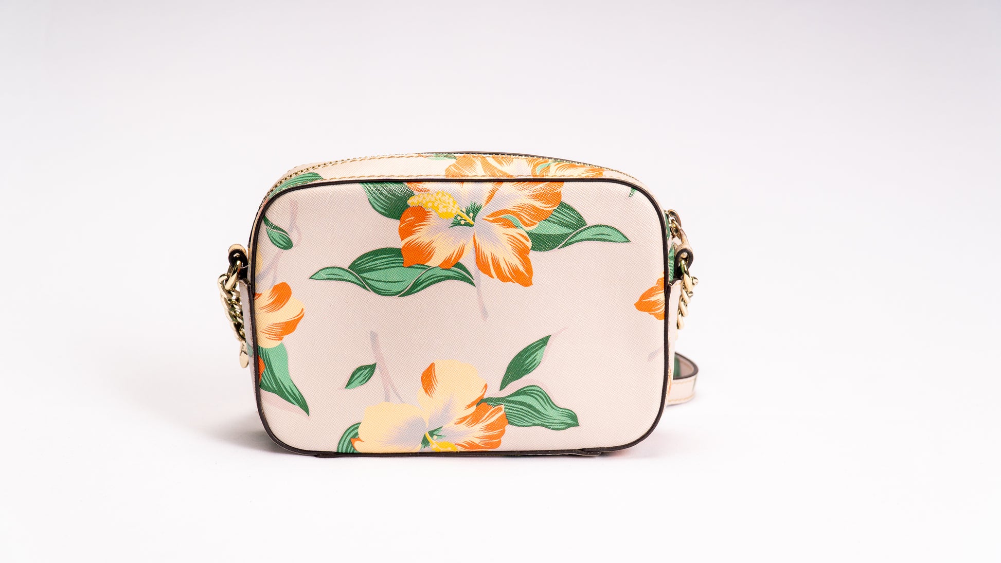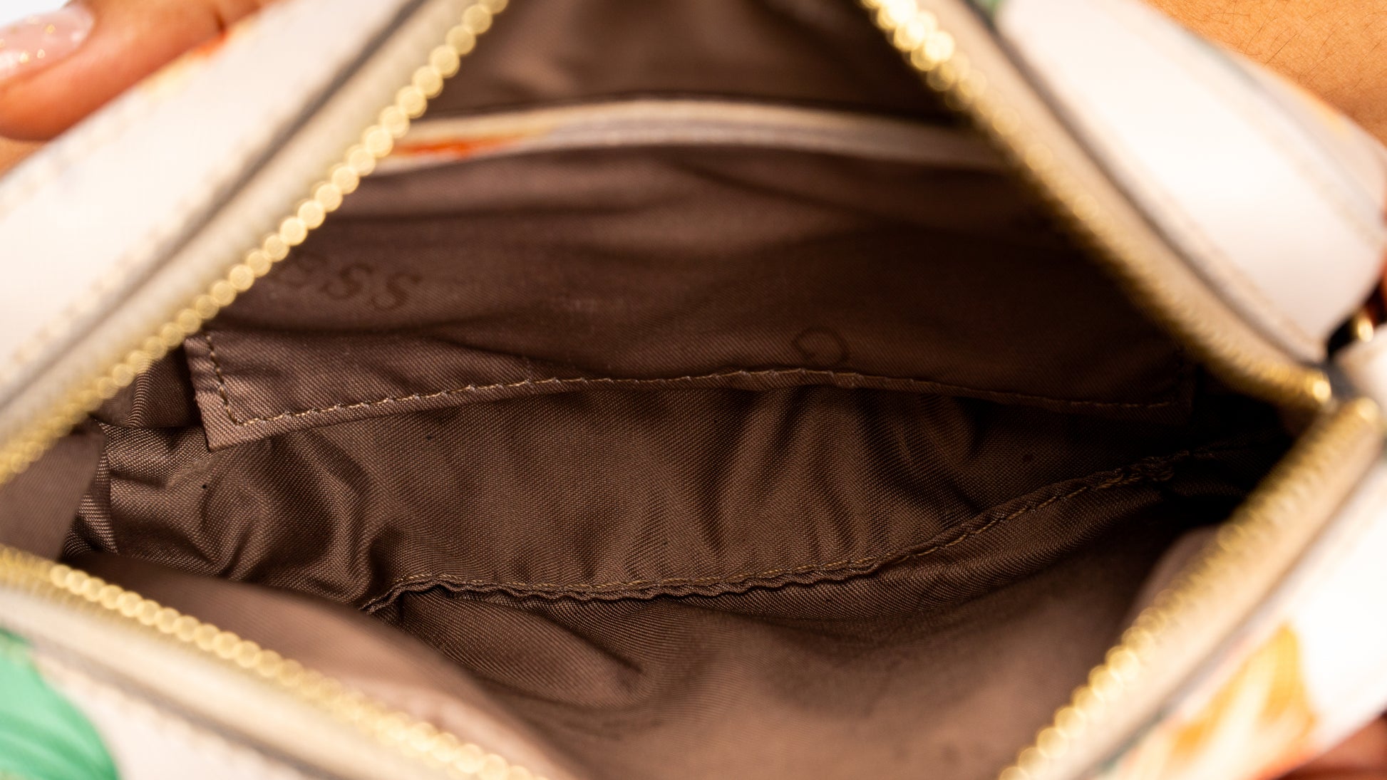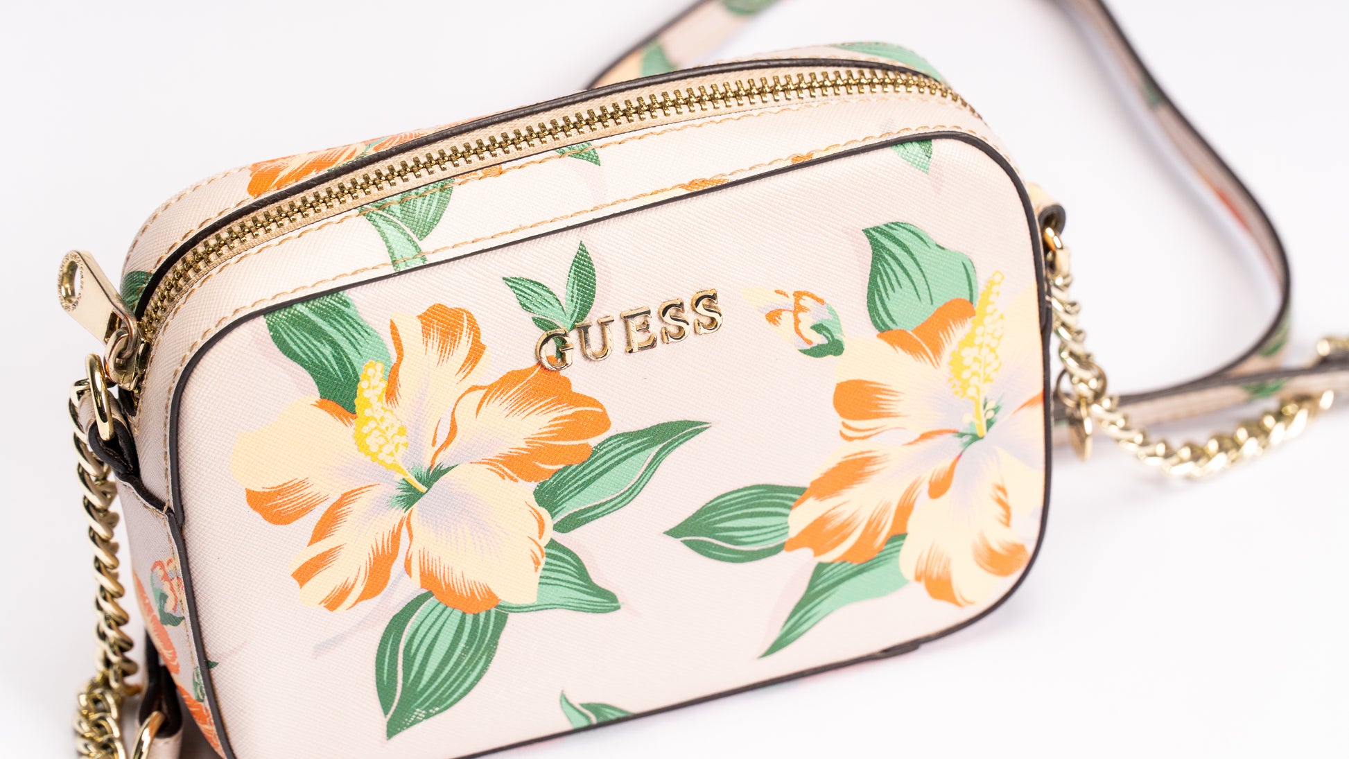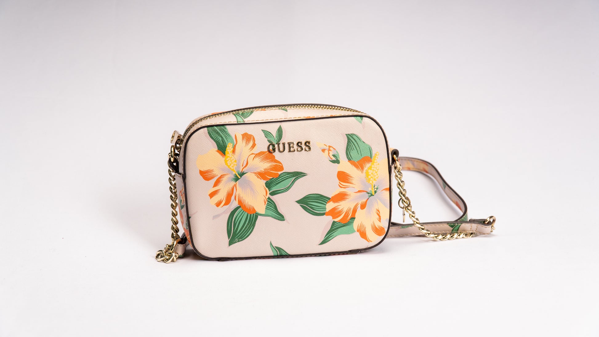 Mala tiracolo Guess, em padrão floral, com fecho éclair metálico dourado e corrente metálica.